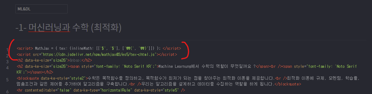 티스토리에선 Latex 표현을 하기 위해서 Html 태그를 추가해 줘야한다.