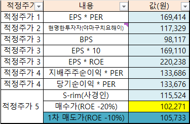 크게 5개의 적정주가 계산방법으로 계산해봤다.