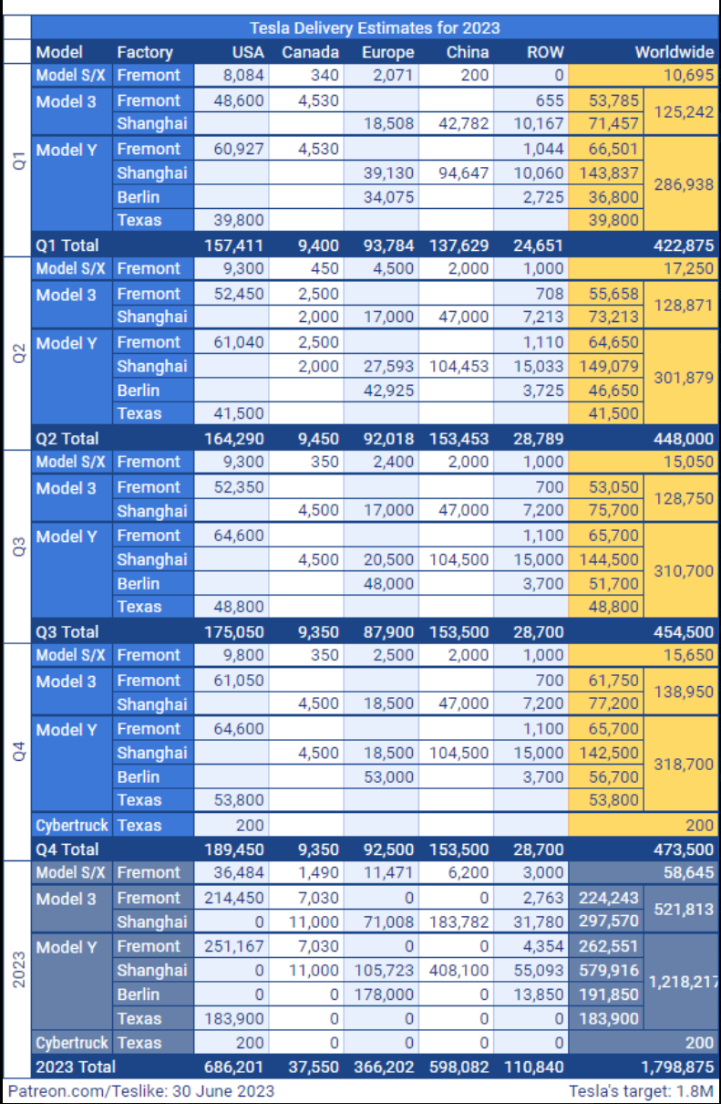 Tesla 배송에 대한 자세한 표는 다음과 같습니다. 2023년 2분기의 최종 추정치는 다음과 같습니다.