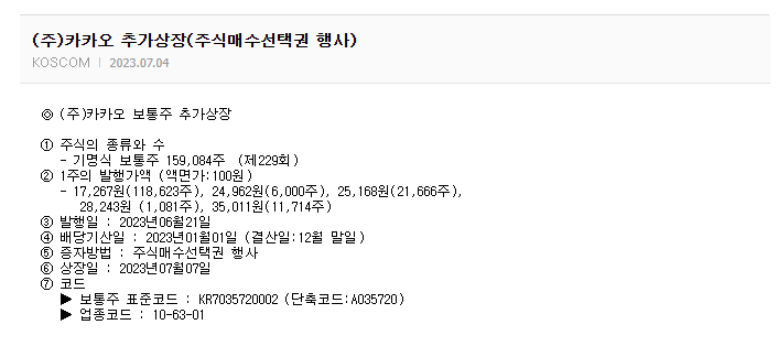 오늘 뉴스공시가 하나 올라왔다. 바로 (주)카카오 추가상장(주식매수선택권 행사)