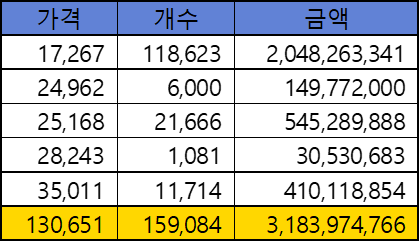 위에 나온 공시를 표로 정리했고 노란색 부분은 합계이다.