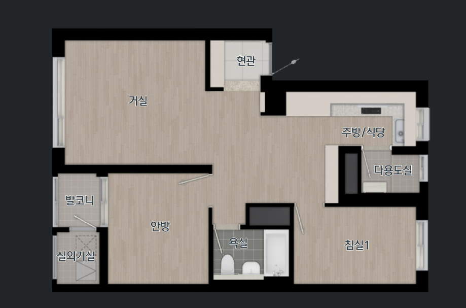 주방이 조금 작은대신 거실이 25평급으로 나왔습니다. 주방을 잘 안가는 저로썬 아주 만족스러운 구조 입니다 :)