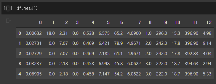 안녕하세요~ 1. 데이터 로딩 보스턴 주택 가격에 관련된 데이터셋은 14개의 변수(열)로 구성되어있습니다. 각 열은 주택의 속성을 나타내는 Feature나타냅니다. 예를 들면 주택의 크기나 동네 범죄율, 평균 연령 등이 있겠네요. 각 행은 개별 주택을 말합니다. 즉 행만큼 주택의 개수가 있다고 생각하시면 됩니다. 정리하자면 보스턴 데이터셋은 하나의 행이 하나의 샘플(주택)을 나타내고, 각 열에 맞춰 해당하는 데이터가 입력되어 있습니다. import numpy as np import pandas as pd # 싸이킷런에서 제공하는 데이터셋을 가져오겠습니다. from sklearn import datasets dataset = datasets.load_boston() #데이터셋 에 대한 설명이 적혀있습니다...